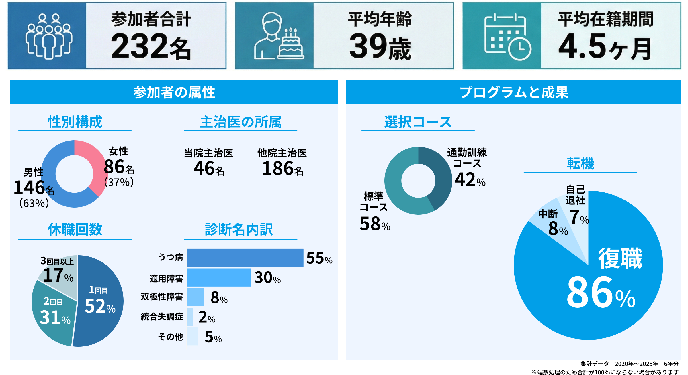 A 当センターでは、利用者属性や復職状況などの実績を公開しています。(詳細はこちらをご確認ください)数値は時期や条件により変動するため、必要に応じて個別にご説明しています。企業様の判断材料としてご活用ください。