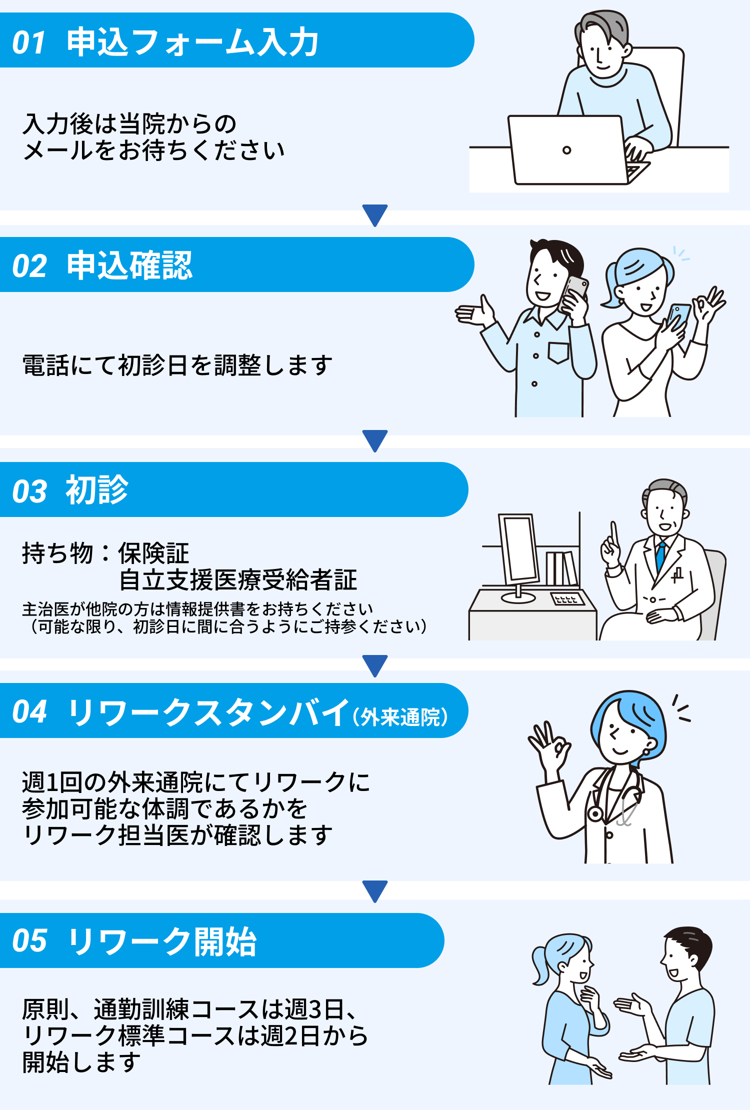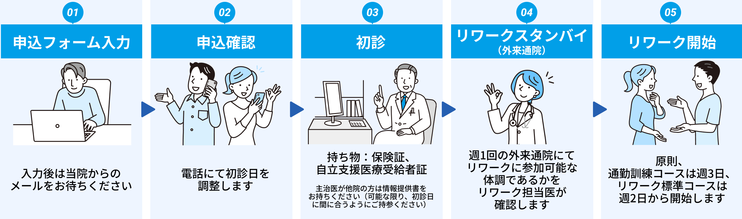 他の精神科医療機関へ通院中の方でも、主治医を変更せずにご参加いただけます。転医に伴う不安が軽減するので、職場の方からも休職中の社員様に対しリワークを経て復職するよう勧めやすくなります。もちろん、リワーク期間中だけ当院に転医することも、リワーク期間の途中で転医することも可能です。 ※主治医からの紹介状は必須となります。