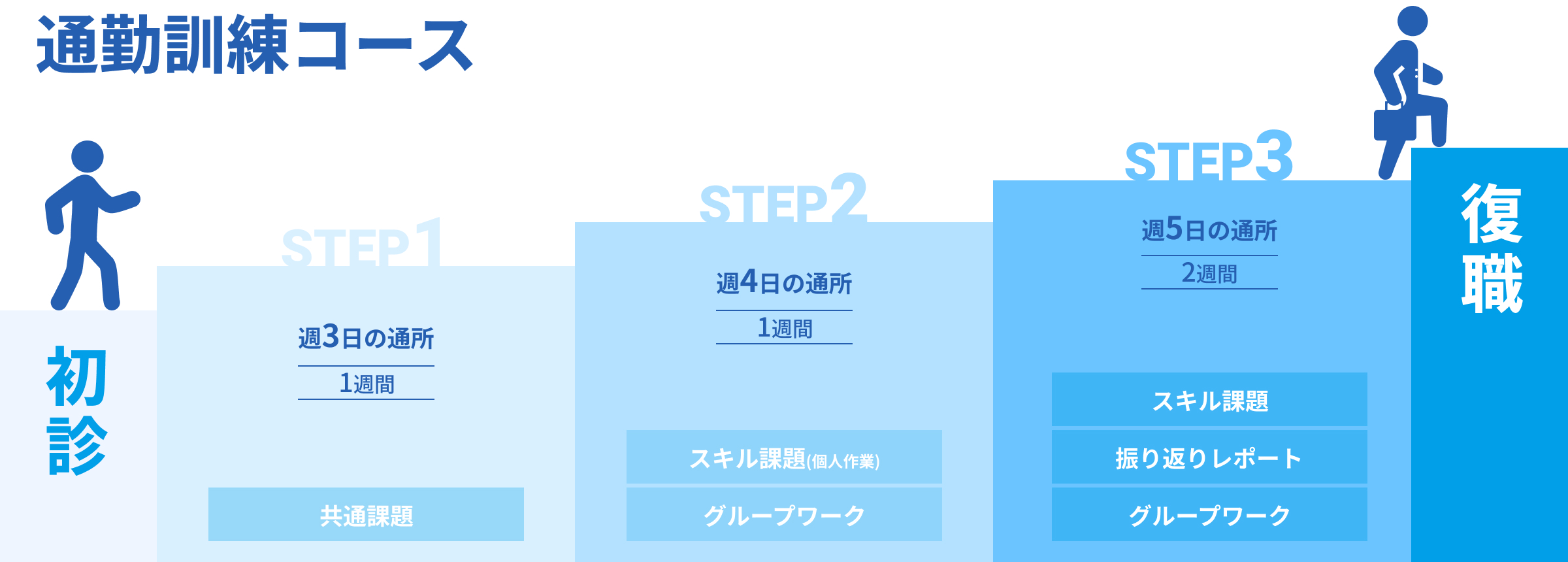 ※終了までの目安は、通勤訓練コースの場合約1ヶ月、リワーク標準コースの場合約4カ月程度となります。あくまで目安ですので、プログラムの進捗や参加状況によって変更になる場合があります。予めご了承ください。